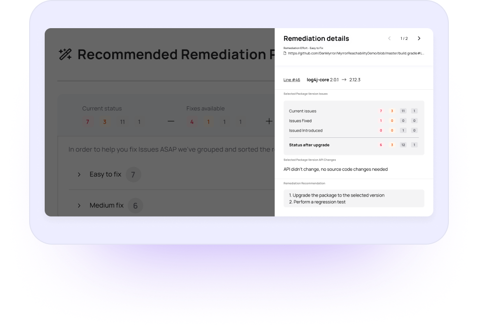 Myrror understands the differences between package versions, including function removals, function parameter changes and more. It then uses this context to calculate the effort required to remediate a risk and analyzes the impact it will have, including whether the change will break your code or not.