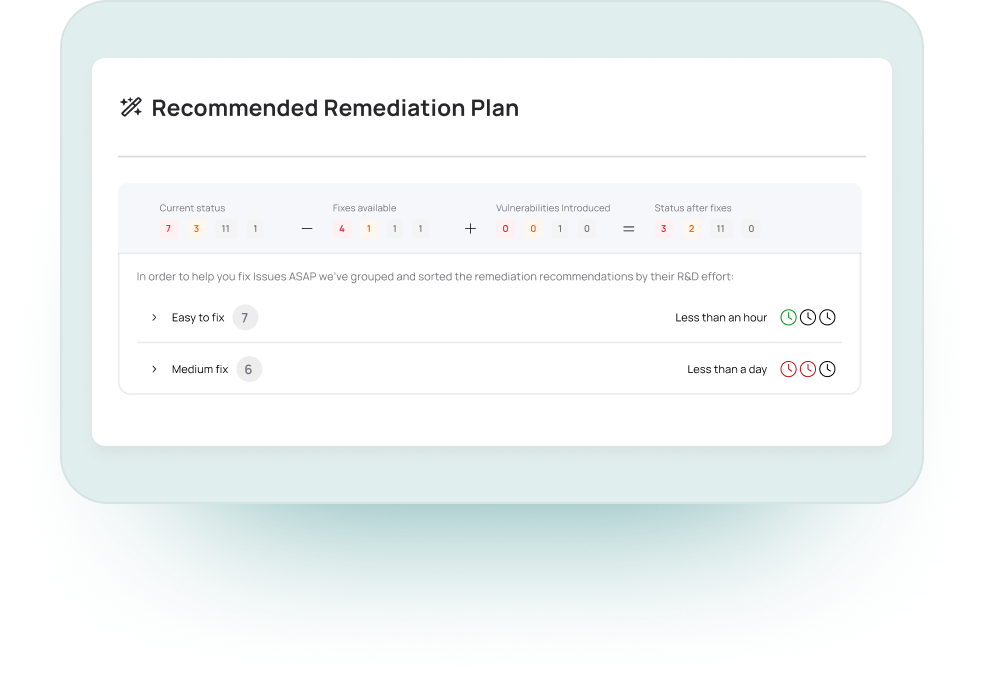 Bridge the gap between security and engineering by calculating the optimal path to remediation and providing a highly-detailed developer-friendly fix list. The platform analyzes the impact of each remediation step, and estimates the amount of time and effort required to perform each fix, making the handoff process between security and engineering seamless.