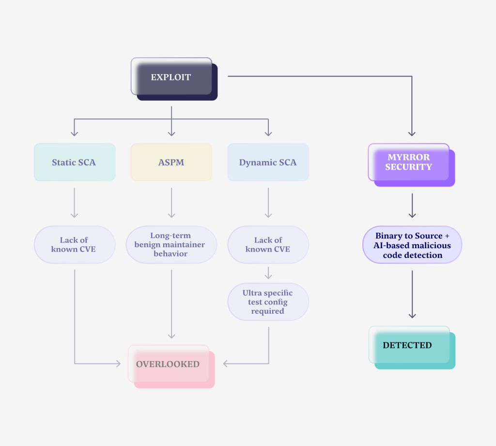 In the XZ case, the backdoor was embedded within the build processes of the upstream package. In this way, the attacker has created a (supposedly) trusted upstream source code that would actually become malicious once it is compiled. When Myrror is on premise, it is exactly this mismatch between the trusted published source code and our application dependency binaries that would raise a flag and be marked suspicious. From this point, Myrror’s system would reverse engineer this difference, and consequently use its AI-based malicious code detection algorithms to spot any piece of code that might present a threat – thus exposing the clever attack.